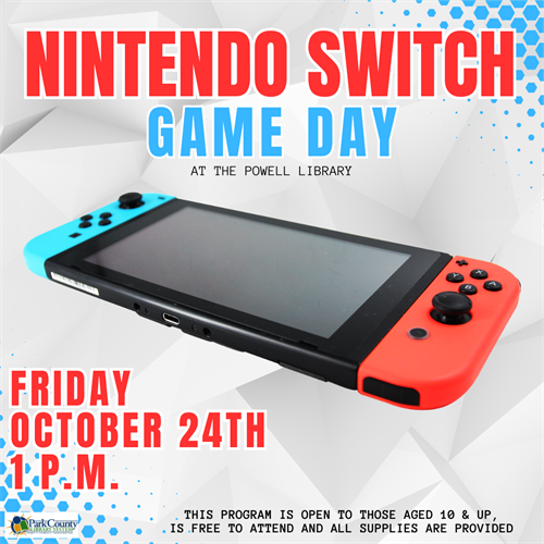 Bring your friends to the Powell Library on Friday, October 24th at 1 p.m. for an Ages 10 & Up Nintendo Switch Game Day!!