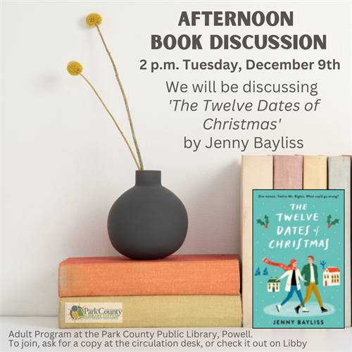 The discussion group will be meeting at 2 p.m. on Tuesday, December 9th in the Homesteader Hall Meeting Room at the Park County Fairgrounds to discuss 'The Twelve Dates of Christmas' by Jenny Bayliss.