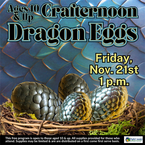 At November's Ages 10 & Up Crafternoon we will be making Dragon Eggs out of Styrofoam eggs and flat push pins on Friday, November 21st at 1 p.m.!