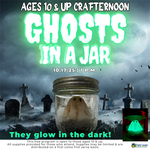It's about to get get spooky at the Ages 10 & Up Crafternoon on Friday, October 17th at 1 p.m. as we will be creating glow in the dark ghosts in a jar!