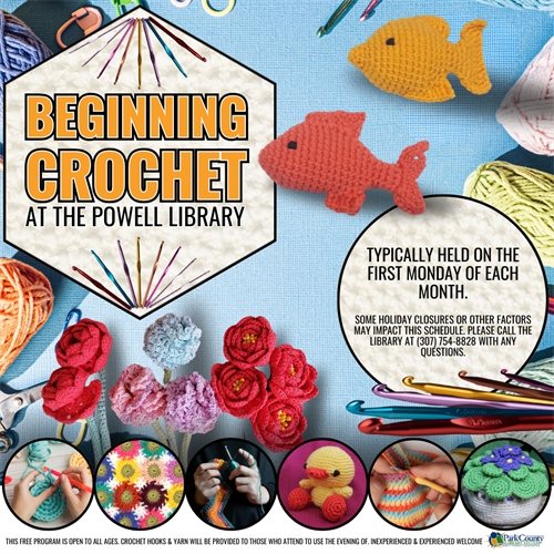 Beginning Crochet is open to all ages and free to attend and is typically held on the first Monday of each month (Some holiday closures and other factors may effect this schedule. Please call the Powell Library at 307-754-8828 with any questions.